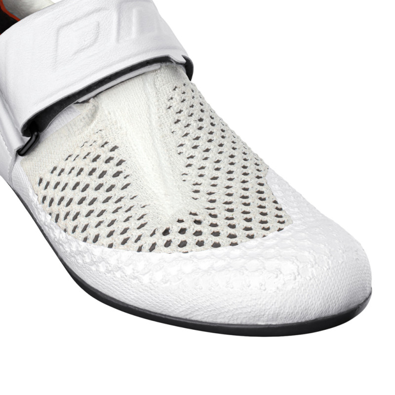Diseñadas específicamente para triatlón, las DMT Oxy son zapatillas de alto rendimiento que destacan por sus transiciones ultrarrápidas. Su gancho trasero permite una entrada increíblemente rápida, mientras que el cierre de velcro garantiza un ajuste preciso e instantáneo. La suela de carbono ultrarrígida, combinada con una altura de suela un 30 % menor, proporciona una conexión inigualable entre el pie y el pedal para una transferencia de potencia óptima. La parte superior Dimple Tech, con su superficie microtexturizada, mejora la aerodinámica, mientras que las microperforaciones aseguran una ventilación constante y un rápido drenaje del agua, una ventaja real para carreras bajo la lluvia o en condiciones extremas.