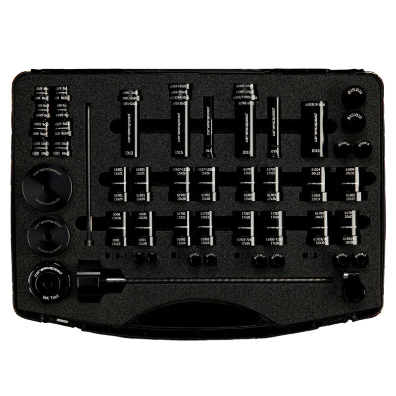 El kit de herramientas de prensado de rodamientos de rueda CeramicSpeed es un juego de calidad profesional diseñado para la extracción e instalación precisa de rodamientos de rueda, compatible con bujes modernos. El sistema incorpora un rodamiento CeramicSpeed oculto en el cabezal de la herramienta para proporcionar una presión excepcionalmente suave con menos esfuerzo.