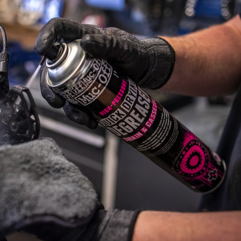Su fórmula de secado rápido no deja residuos, lo que significa que se evapora para dejar la zona lo más limpia posible. En resumen, este Desengrasante de Secado Rápido de Alta Presión Muc-Off dejará prácticamente su cadena y cassette como nuevos, evitando que pierda potencia en la carretera.