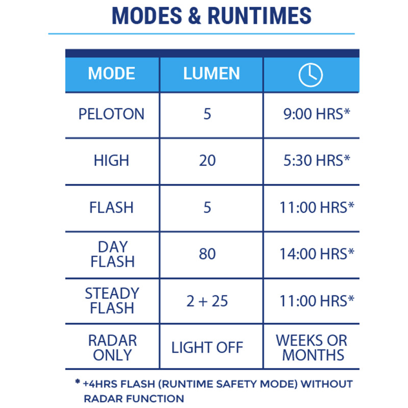 - 6 modos : Alto, Pelotón, Flash, Intermitente diurno, Intermitente continuo, Solo radar