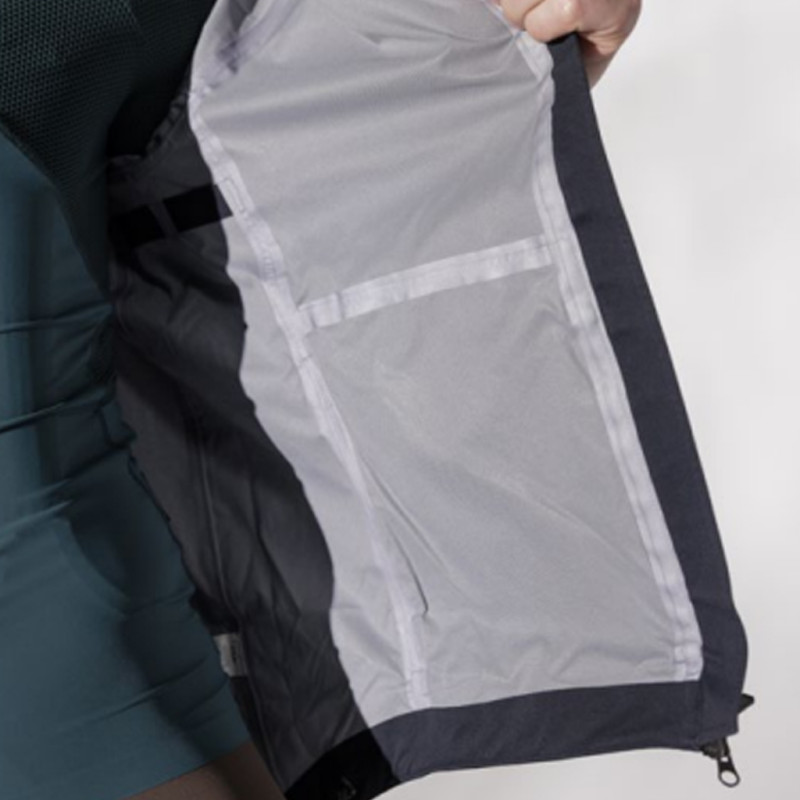 El tejido principal cuenta con una membrana impermeable de 3 capas que ofrece una protección de 20 000 mm / 20 000 g/m², garantizando una excelente impermeabilidad y una transpirabilidad excepcional. El tratamiento DWR sin PFC repele eficazmente el agua y el viento, respetando el medio ambiente. Las zonas de ventilación estratégicamente ubicadas bajo los brazos y en la espalda permiten regular la temperatura durante el esfuerzo prolongado.