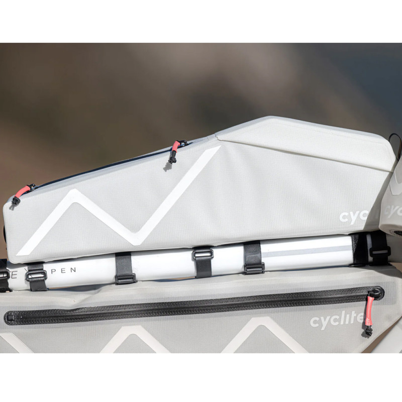 Es compatible con todas las bolsas de cuadro Cyclite (FRAME BAG), así como con la gran mayoría de bolsas de otros fabricantes, gracias a la posición ajustable de las correas de montaje.