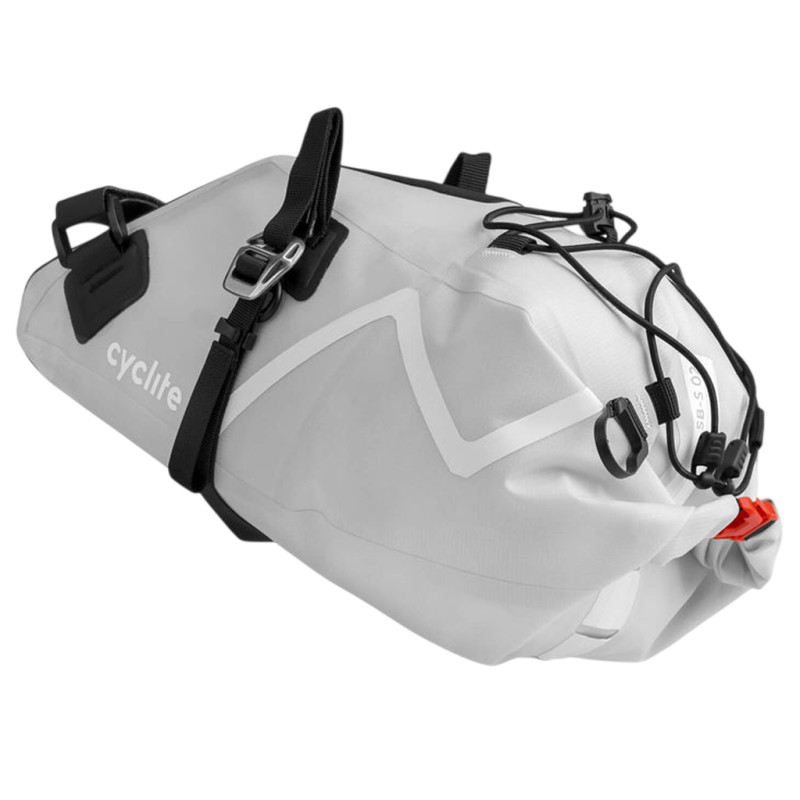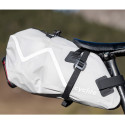 La bolsa de sillín Cyclite Small / 02 está disponible en dos colores: gris claro y negro. Incluye la bolsa y un manual de instrucciones. El cierre enrollable permite un acceso rápido al contenido, mientras que las correas elásticas externas permiten sujetar equipo adicional (chaqueta, saco vivac, etc.). Un soporte para luz trasera y elementos reflectantes completan las características de seguridad.