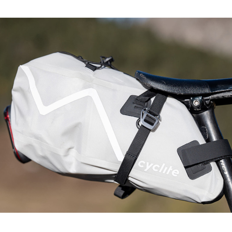 Su mayor fortaleza reside en el material patentado LiteGrid-RN200T3, desarrollado internamente por Cyclite: dos capas de nailon (PA/N6.6 reciclado de 200D) unidas mediante una técnica de tejido ripstop, recubiertas por ambos lados y soldadas por alta frecuencia. El resultado, una bolsa impermeable, fácil de limpiar y extraordinariamente rígida para su peso. El sistema de montaje patentado SR-System incorpora un gancho de aluminio anodizado que se adapta a la tija del sillín y garantiza una sujeción segura y sin holguras, incluso en tramos técnicos o a alta cadencia.