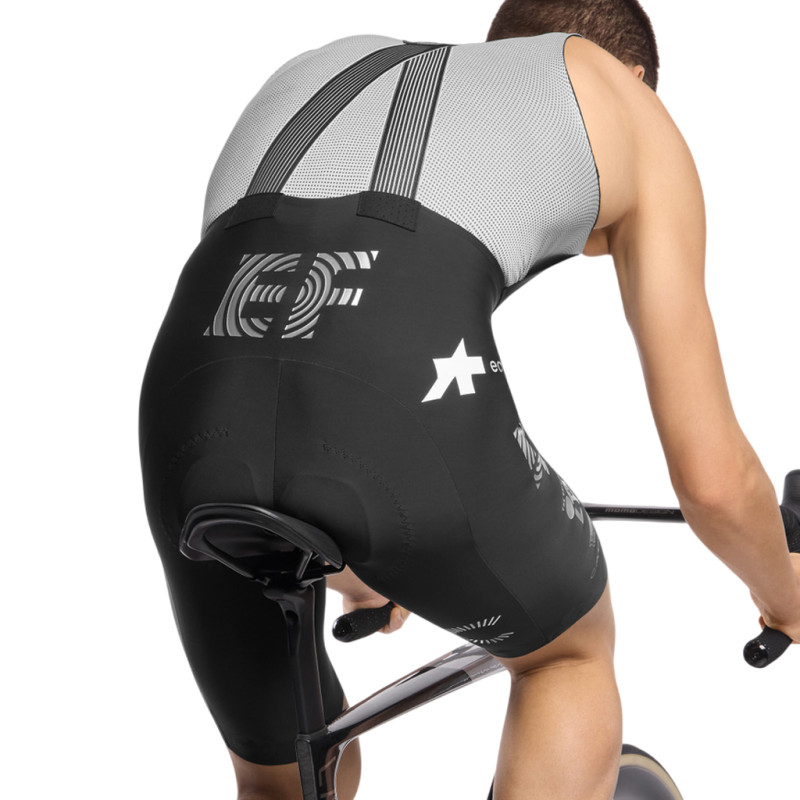 Con protección UPF50+, control de olores y propiedades hidrofóbicas, este culotte con tirantes Assos Equipe R S11 EF - We Ride In Peace también es muy cómodo. Incorpora una badana Shock-Absorb Damping Mono, equipada con capas de espuma compresiva de 9 mm. Esta badana cuenta con tecnología 3D Waffle, con espuma perforada de tres capas para una mayor transpirabilidad y ligereza. Gracias a la tecnología Golden Gate 2.0, este culotte corto con tirantes ofrece una fabricación flotante que se mueve contigo mientras pedaleas.