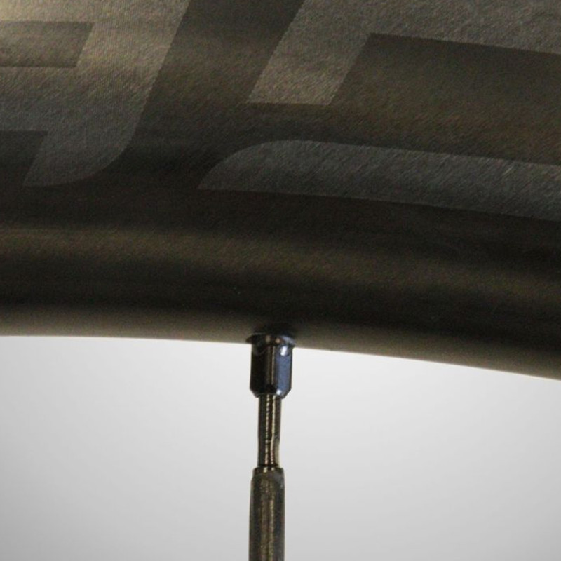Los radios MK CTM 2.5G, auténticos radios de carbono estructural, combinan fibra de carbono T1000, titanio y magnesio. Su sección transversal optimizada de 3 mm mejora la rigidez y la eficiencia aerodinámica, adaptándose perfectamente al perfil de la llanta de 45 mm.