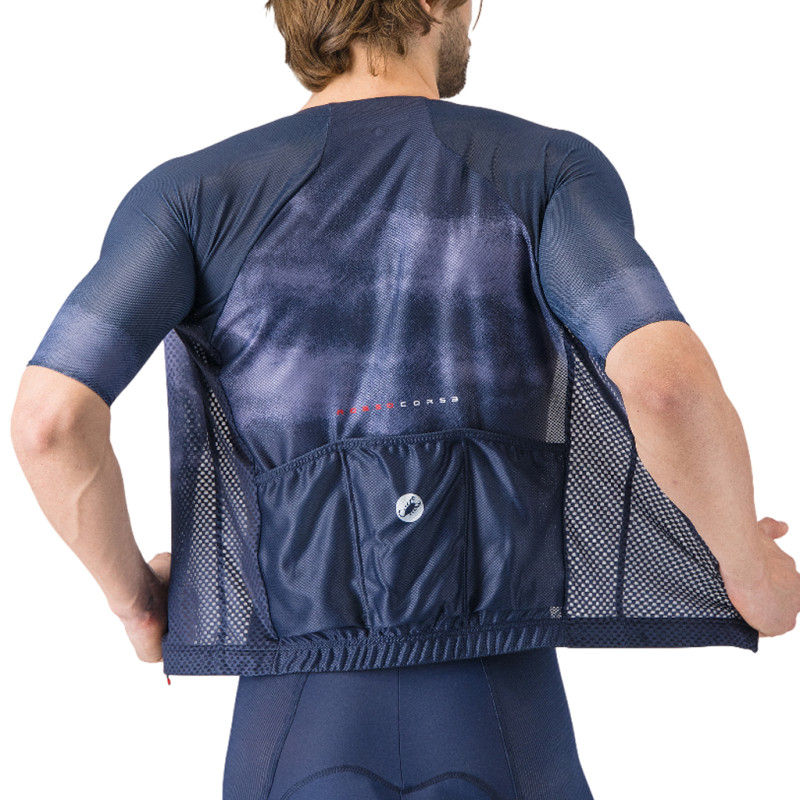 Diseñado para ascensos más rápidos cuando aprieta el calor, el maillot Castelli Climber’s A/C es la máxima expresión de ligereza y frescura. Usado por los ciclistas del equipo WorldTour Soudal Quick-Step en etapas de montaña o días calurosos, fue diseñado para ofrecer la máxima ventilación en ascensos largos y exigentes.
